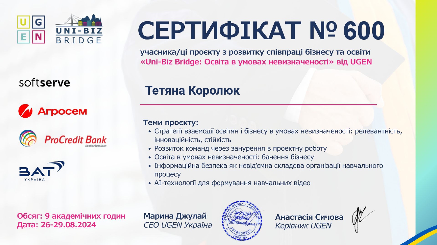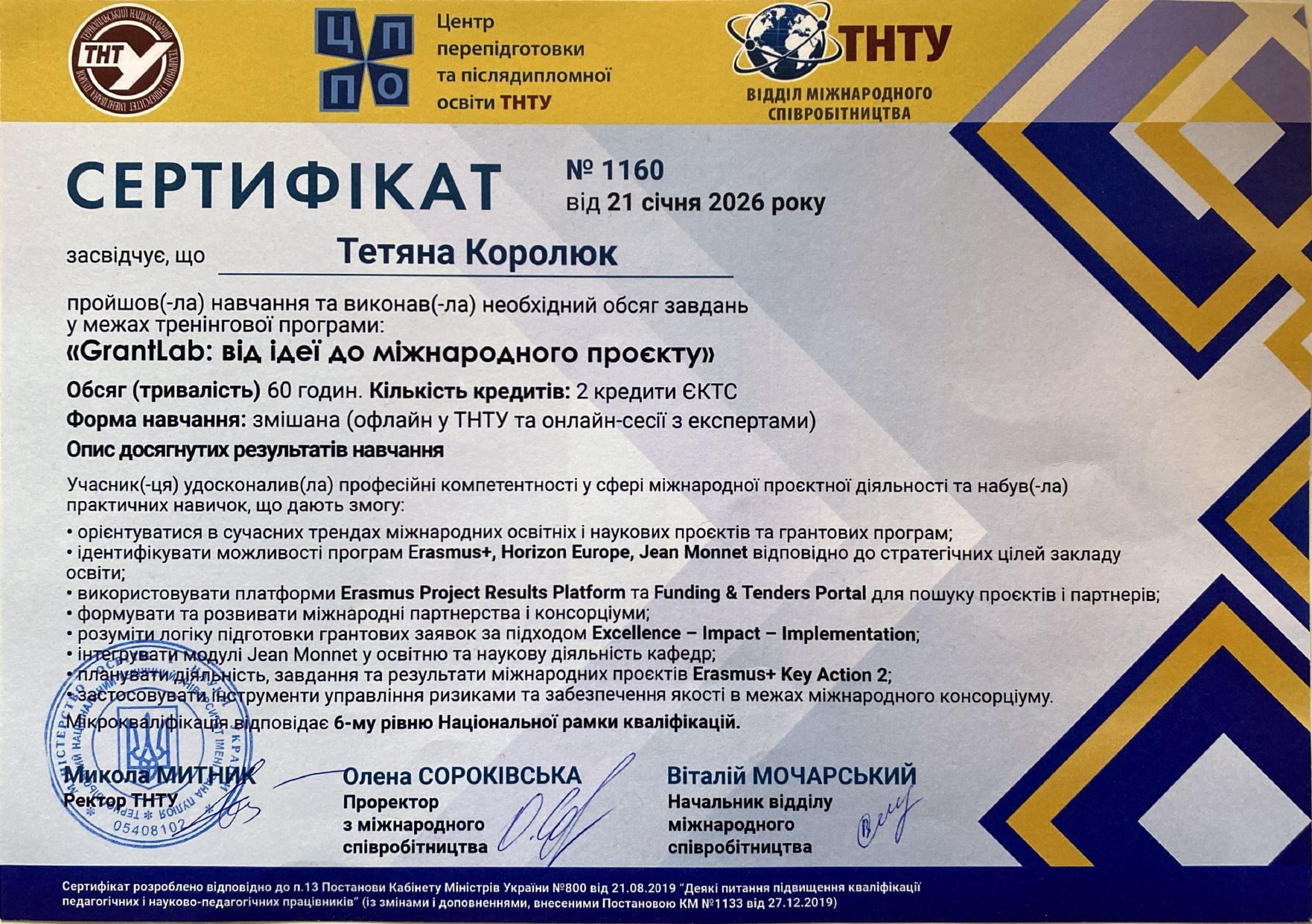 Учасник тренінгового курсу «Academic Teaching Excellence» в рамках міжнародного проекту «Англійська мова для університетів» під егідою Британської Ради в Україні, 2016 р.