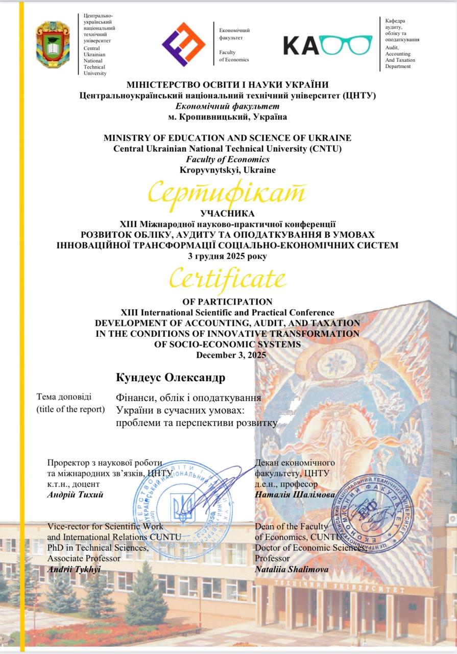 - Kundeus O., Zarudna N., Klym N. Requirements for organization of accounting on service enterprises in the condition of digital economy // Digital economy trends : global challenges, strategy and technologies : monograph / edited by Ghenadie Ciobanu. Galaţi : Editura Universitară “Danubius”, 2021.