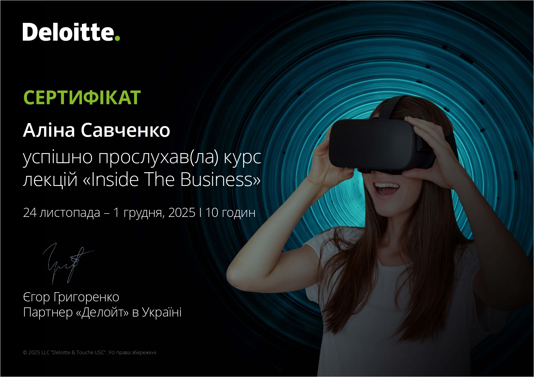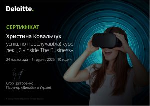 З 24 листопада по 1 грудня 2025 року в онлайн-форматі проходив безкоштовний курс лекцій «Inside The Business». Організатор – Deloitte Ukraine. Компанія є найбільшою за сукупним доходом компанією з надання професійних послуг у сферах, консалтингу, корпоративних фінансів, управління ризиками підприємств та консультування з питань оподаткування й права.