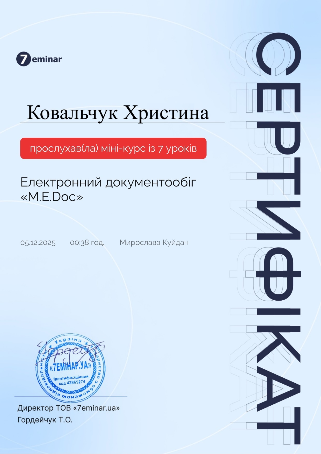 У межах курсу «Електронний документообіг в управлінні та адмініструванні» успішно опанували відеокурс «Електронний документообіг M.E.Doc».